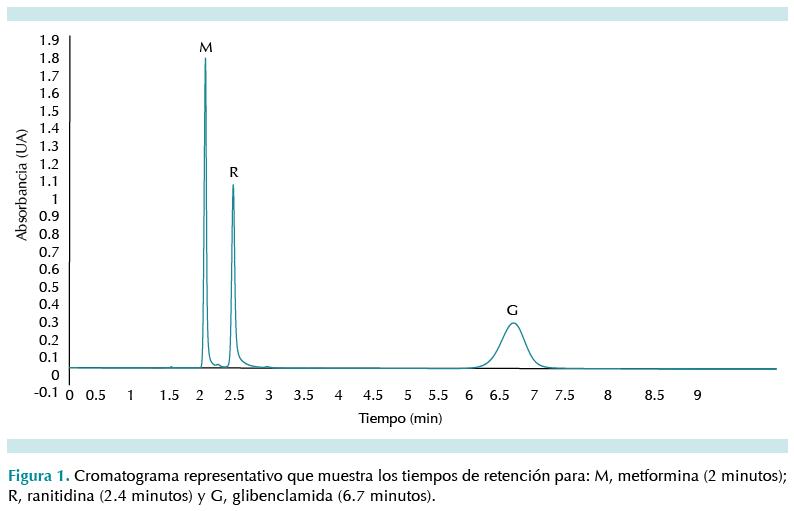 Se empleó un equipo de cromatografía líquida de alto desempeño con espectrofotómetro (UPLC-UV) marca Acquity® (Waters Co., Milford MA, EE.UU). La separación se llevó a cabo en una columna VARIAN Pursuit® C8 150 x 3.9 mm. La velocidad de flujo fue 0.8 mL/min. La columna y el inyector automático se mantuvieron a 40°C. En estas condiciones, los tiempos de retención para metformina, ranitidina y glibenclamida fueron 2, 2.4 y 6.7 minutos, respectivamente (Figura 1).