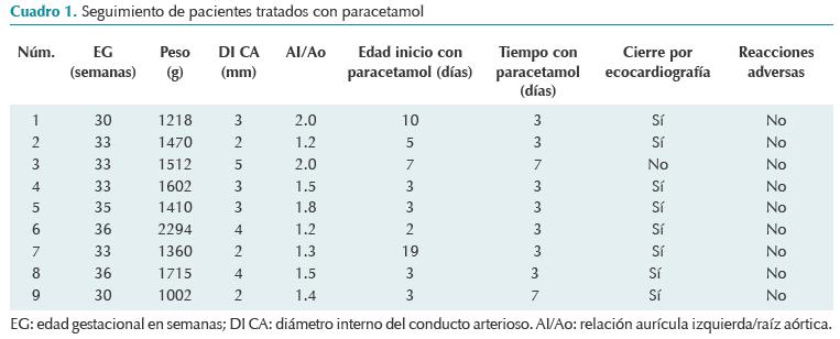 Resultados: se incluyeron nueve recién nacidos prematuros con edad gestacional de 33.2 semanas y peso medio de 1 509 gramos. Cinco (55%) tuvieron índice de Yeh ≥ 3, por ecocardiografía el diámetro interno medio del conducto arterioso fue de 2.81 ± 1.05 mm con una relación aurícula izquierda/raíz aortica media (AI/Ao) de 1.5 ± 0.32. Se detectó el cierre del conducto arterioso en ocho (89%) pacientes; el tiempo medio de cierre fue de 3.4 ± 1.7días. No se identificaron reacciones adversas al paracetamol.
