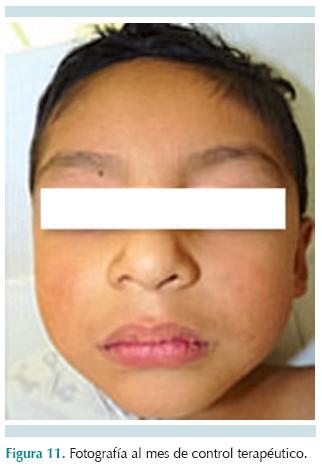 I. Terapia inmediata: en las primeras 24 horas desde que el paciente fue referido a nuestro servicio, después de la ingestión del cáustico, se realizó asepsia de lesiones peribucales con solución fisiológica (40 mL), peróxido de hidrógeno al 3% (2 mL) y solución yodada 10% (5 mL) (Figura 8). Se descartó la presencia de exudado, cuerpos extraños, o ambas cosas. Se indicó a los familiares la colocación de humectadores de piel de labios y comisuras a base de derivados de petrolato; dieta blanda libre de grasas e irritantes por un periodo de siete días. Se retiraron los tejidos costrosos y las lesiones contaminadas. Se programó cita de revisión 5 días después (Figuras 9 y 10).