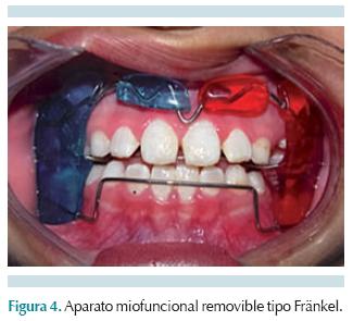 Fase IV. Terapia final: terminada la fase de remodelación se establece el tratamiento directamente miofuncional respecto al crecimiento, desarrollo muscular y de tejidos blandos, así como de oclusión orgánica con aparatos tipo Fränkel. El objetivo será la interacción con la cápsula del tejido peribucal, la tracción de la unión mucoperióstica para realizar modificación en posición muscular y dental, así como la estimulación muscular con modificación de tensión vertical y transversal de los tejidos blandos, desarrollando así patrones normales de apertura y cierre sin limitaciones de la apertura bucal.25,34-36