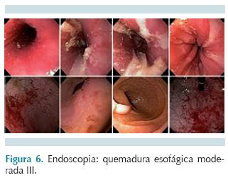 Valoración de neumología y cirugía de tórax: debido a los antecedentes de la ingestión de una sustancia cáustica se realizó una endoscopia de vía digestiva superior, a las 24 horas, para confirmar o descartar quemadura esofágica (Figura 6), ésta demostró esofagitis moderada grado III y gastritis hemorrágica; se agregó al esquema terapéutico omeprazol 1 mg/kg cada 24 horas. Debido a que el paciente tenía al ingreso leucocitosis de 20 000/mm3 con neutrofilia de 92% se sospechó mediastinitis; se efectuó serie de esogafogastroduodenal que no evidenció escape del medio de contraste hacia el mediastino. La radiografía de control no mostró signos de mediastinitis, lesiones en estructuras óseas ni blandas; parénquima pulmonar y silueta cardiaca normales. Por tener adecuada tolerancia a la vía oral se decidió dar de alta al paciente al cuarto día de estancia hospitalaria con un protocolo para cáusticos y cita siete días después.