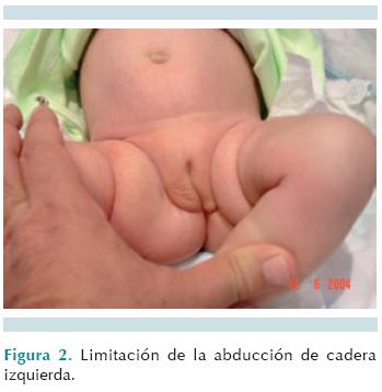 El dato clave en esta edad es la limitación de la abducción de una o ambas caderas ya que normalmente, con las rodillas flexionadas, un recién nacido tranquilo (sin llanto) permite que ambas rodillas toquen la superficie de la mesa de exploración simultáneamente (Figuras 1 y 2).