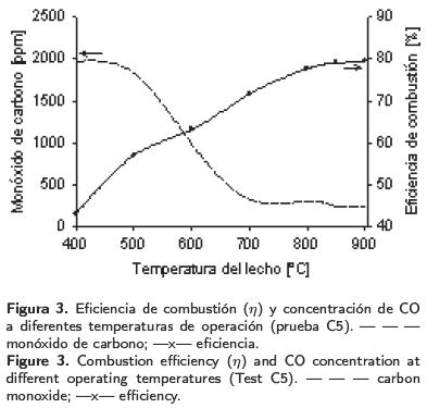 Los datos obtenidos en C5 mostraron que la eficiencia de combustión presentó una tendencia significativamente creciente con respecto a la temperatura y la concentración de CO disminuyó en la medida que se incrementó la temperatura de operación (Figura 3). En 400 °C se obtuvo una eficiencia de aproximadamente 43% en comparación con una eficiencia de alrededor de 80%) en una temperatura de 900 °C. Por su parte, la concentración de CO fue de 1 973 ppm para la menor temperatura, mientras que esta concentración disminuyó hasta alcanzar 237 ppm en la temperatura mayor.