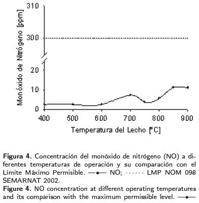 En la planta piloto descrita por Saxena & Jotshi (1994), se registraron descargas de emisiones de SOx entre 20 y 35 ppm, entre 100 y 139 ppm para NOx, mientras que los prototipos de EIC y EPI detectaron concentraciones de 350 ppm para SOx y 35 ppm para NOx. Las descargas del incinerador de residuos clínicos fueron de 51 mg m3 de NOx y 17 mg m3 de SO2 (Swithenbank et al. 1997). Cabe mencionar que en el sistema de combustión probado en este estudio, las concentraciones de SOx y NOx no superaron 40 ppm. Además, las temperaturas de proceso fueron menores a los 900 °C, lo que desfavorece la formación del NOx térmico. Existen otras especies químicas que pueden analizarse en las descargas de gases de estos prototipos. Sin embargo, en las pruebas experimentales sólo se analizaron NO, NOx, SO2, CO, CO2, temperatura de gases y temperatura de operación en el lecho porque son los gases de combustión de mayor relevancia ambiental para el efecto invernadero y, por lo tanto, el cambio climático global (Miller 2002).