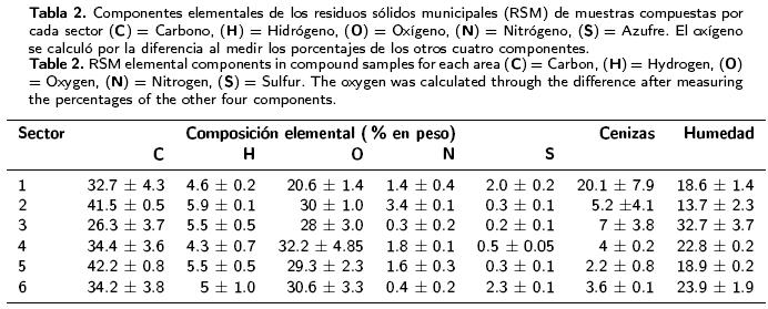 La estimación sobre la cantidad de RSM generados en los seis sectores de la ciudad de Villahermosa mostró que el sector centro (SI) fue el sector con mayor generación de RSM, con una producción de 210 t día1 y una densidad promedio de 230.3 kg m3. Los otros cinco sectores produjeron menores cantidades de peso volumétrico y generación de RSM (Tabla 1). En promedio, los seis sectores generaron 740 t día1 de RSM durante todo el periodo de muestreo. En algunos sectores, ciertos materiales reciclables son recuperados antes de su disposición final. En México, esta preselección de material de reciclaje es conocida como pepena. Debido a la pepena, la información mostrada en la Tabla 1 no representa la generación real de RSM sino la composición de los RSM en el sitio de disposición final. De acuerdo a lo previamente establecido, se decidió que el SI sería el que aportara la materia prima para la evaluación del combustor de lecho fluidizado, ya que este sector representa aproximadamente el 30 % del volumen total de RSM generados en la ciudad y la pepena disminuyó la cantidad de materiales reutilizables tales como telas y trapos, aluminio, unicel, cartón y latas. Los RSM en el SI contuvieron los siguientes subproductos: plástico rígido (10%), papel (17.27%), polietileno (15.45%), cartón plastificado (7.27%), materia orgánica (43.63%), vidrio (3.18%) y residuos finos (2.74%). Finalmente, los análisis de composición elemental a los residuos generados en cada sector fueron determinados (Tabla 2).