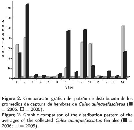 De los 12 209 mosquitos hembra recolectados en el 2006, 6 080 (49.8%) correspondieron a la especie C. quinquefasciatus. Este porcentaje fue ligeramente mayor al obtenido en el 2005, que fue del 40.8%. Un total de 1988 ejemplares de C. quinquefasciatus se recolectaron durantejulio (Tabla 2).