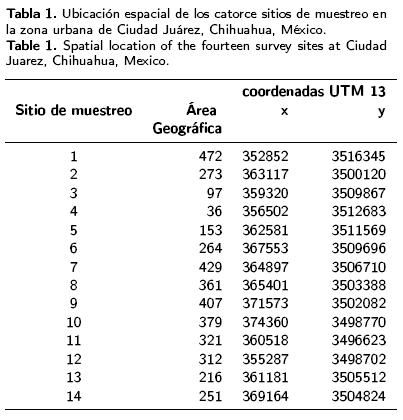 Los mosquitos se recolectaron durante 14 semanas en el año 2006. El muestreo inició el 27 de junio y finalizó el 26 de septiembre. Los catorce sitios fijos de muestreo se establecieron a una distancia promedio entre ellos de 4 000 m para evitar en lo posible la sobreposición en su área de influencia (Tabla 1), ya que la capacidad de vuelo de C. quinquefasciatus ha sido registrada en 2 000 m (TureiI et al, 2005). Un total de 196 recolectas se efectuaron mediante minitrampas CDC de luz (Modelo 512) y C02 (hielo seco) como atrayente. Las minitrampas funcionaron con una fuente de energía a base de baterías 6V LiNe recargables y se siguieron las recomendaciones proporcionadas por Gleiser et al. (2002). Las trampas operaron por 12 h consecutivas, desde las 19:00 h de un día hasta las 7:00 h del día siguiente.