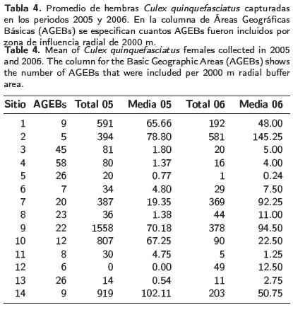 El número promedio de hembras recolectadas en el 2005 en la totalidad de AGEBs resultó similar (t = 0.63; ρ = 0.543) al promedio de las recolectadas en el 2006 durante julio (Tabla 4). Las tendencias gráficas de ambos periodos mostraron consistencia entre sitios con alta y baja densidad de captura (Figura 2). Estos resultados sugieren la pertinencia del modelo geoespacial del año 2005 validado con el modelo temporal del año 2006.