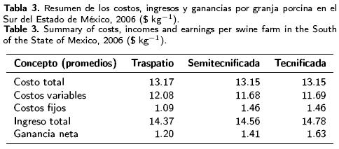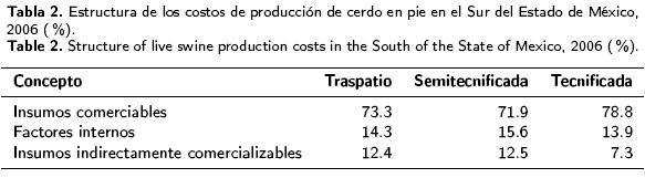 Las estimaciones de costos de producción porcícola en el sur del Estado de México confirmaron la alta proporción que guardan los insumos comerciables, que en su mayoría están constituidos por los alimentos. Estos resultados confirman lo obtenido por otros trabajos, que los ubicaron entre 65 y 95 %> (BarrónAguilar et al. 2000; GarcíaSánchez et al. 2000; SosaMontes et al. 2000; MagañaMagaña et al. 2002). Los costos unitarios de producción mostraron diferencias pequeñas, por lo que no fue tan evidente la ventaja tecnológica que tiene la granja tecnificada respecto a los otros tipos de granjas, se supone que en la primera existe una mayor productividad, mayor integración en la elaboración del alimento balanceado y generación de economías de escala en el manejo de la granja (MagañaMagaña et al. 2002). Esto pudo deberse a que las granjas semitecnificadas y de traspatio, sólo estuvieron operando entre 78 y 85 % de su capacidad instalada, además, en estas últimas, el costo por mano de obra no se evaluó a salarios efectivos de mercado, ya que estuvo constituida principalmente por trabajo familiar.