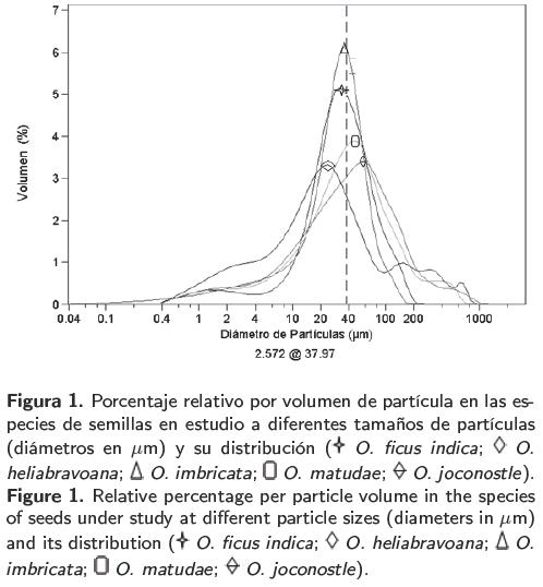El tamaño promedio de partículas fue de 37.97 μm en las semillas de las cinco especies evaluadas. Los tamaños promedios de las diferentes especies, variaron entre 23.81 y 55.13 μm. Las variaciones de los tamaños en general para las partículas oscilaron desde 0.044 hasta 1 143.00 μm (Tabla 1). Los valores de tamaños de partículas más pequeños correspondieron a la especie O. imbricata (0.044 194.2 μm), en tanto los valores mayores fueron de la especie O. joconostle (0.412 1 143 μm). En la Tabla 1 se muestran los porcentajes de partículas menores de 0.45 μm que mide el propio equipo. En todos los casos los valores del porcentaje del coeficiente de variación resultaron menores del 10%.
