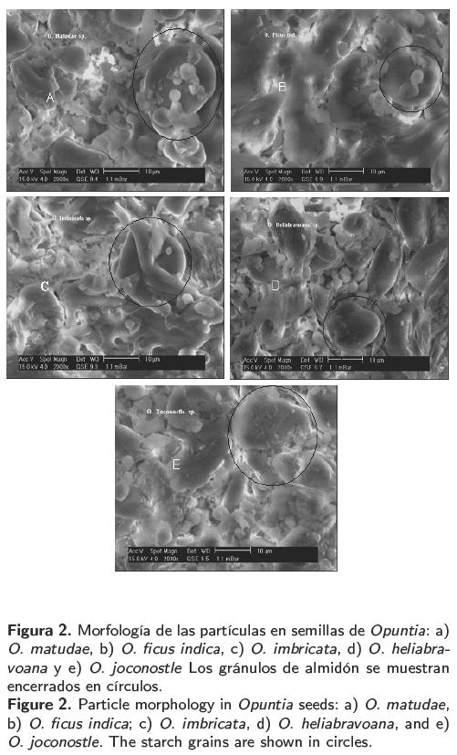 Las semillas del género Opuntia constituyen actualmente un desperdicio. Encontrar algún componente básico que permita su uso como complemento nutritivo en la elaboración de otro producto resultaría de interés socioeconómico. El objetivo fue evaluar la morfología y determinar el tamaño y la distribución de partículas que conforman las semillas de las siguientes especies: Opuntia heliabravoana Scheinvar, O. imbricata Haw, O. matudae Scheinvar, O. joconostle Haage y O. ficus indica Miller. Las semillas fueron molidas y la extracción de las partículas se realizó en suspensión con agua fría. Para valorar su morfología se realizaron observaciones al microscopio electrónico (MEB). El tamaño y distribución fueron medidos en un analizador de tamaño de partículas por difracción de rayos láser. Los tamaños de partículas variaron entre 23.81 y 55.13 μm. La variación y distribución de tamaños osciló desde 0.044 hasta 1 143 μm.El tamaño promedio de partículas de las cinco especies fue de 37.97 μm y por sus dimensiones se asemejan y aproximan a los tamaños promedios medidos en MEB. Los gránulos predominantes fueron de forma semiesférica y correspondieron a gránulos de almidones. La estimación de los tamaños promedios de partículas y morfologías resulta importante para asociar resultados obtenidos en evaluaciones histoquímicas previas, con los almidones contenidos en ellas.