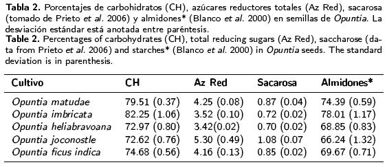 Las evaluaciones previas de caracterización fisicoquímicas (Prieto GF, Filardo KS, Pérez CE, Beltrán HRI, Román GAD, Méndez MMA 2006. BIOAGRO 18 (3): 163169) coinciden con los contenidos más elevados de carbohidratos (> 75%) y de almidones (> 70%) corresponden a las especies O. imbricata, O. ficus indica y O. matudae (Tabla 2). Los hidratos de carbono son el mayor constituyente de los granos o semillas. En los granos de cereales se ha registrado una variación de 70 a 85% de hidratos de carbono (Dendy DAV, Dobraszczyk BJ 2004. Cereales y productos derivados. Química y tecnología. Ed. Acribia. Zaragoza) y mayor cantidad de carbohidratos ha implicado una mayor cantidad de almidón (Blanco MA, Montero MA, Fernández Μ 2000. Arch Latinoam Nutr. 50: 6274).