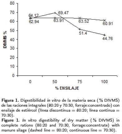 Los resultados de DIVMS en la proporción de 70:30, fueron 61.1, 63.9, 63.5 y 60.9% (R2 = 0.94; p < 0.05) y para la relación 80:20 de 62.9, 69.4, 51.4 y 44.7% (R2 = 0.85; p < 0.05), para los niveles de 0, 50, 75 y 100 % de ensilaje de estiércol. La máxima digestibilidad estimada fue a 27.65 y 28.37 % de ensilaje estiércol para las relaciones forraje concentrado 70:30 y 80:20, respectivamente (Figura 1). Los resultados indicaron que a niveles mayores de 2728 % de ensilaje de estiércol disminuyó la DIVMS. Los datos obtenidos en este estudio son similares a otros resultados in vivo (CobosPeralta MA 1987.