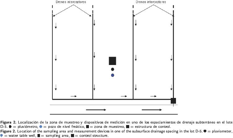 Al centro de cada espaciamiento de drenaje se ubicó la zona de muestreo con una anchura de 5 m y una longitud de 7.2 m, en la que se extrajeron las muestras de suelo para las determinaciones de las diferentes formas de N y la HG. También se instaló un pozo de observación para la medición de niveles freáticos (NF) y un pluviómetro para cuantificar la cantidad de precipitación (Figura 2).