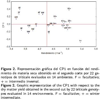 Las comparaciones entre las medias de los genotipos durante el primer corte revelaron que los rendimientos promedios a través de ambientes variaron entre 4.172 y 5.887 t ha1. En el segundo corte, los rendimientos promedios oscilaron variaron 3.541 y 5.355 t ha1 , mientras que la productividad promedio de forraje seco acumulado varió entre 8.863 y 9.981 t ha1 (Tabla 3). Los genotipos 7, 13 y 1 de hábito intermedioinvernal registraron el mayor rendimiento biológico acumulado en los dos cortes, con 9.981, 9.901 y 9.882 t ha1 de forraje seco, respectivamente. En el primer corte, el rendimiento de forraje seco en los tipos facultativos (F) fue significativamente mayor (> 16.3%) que el de los tipos intermedioinvernal (+) (T2 de Hotelling; p < 0.01). Lo inverso sucedió en el segundo corte, en donde los tipos intermedioinvernales produjeron mayor cantidad de forraje seco que los facultativos (> 23.6 %). No obstante, entre los dos tipos en la producción acumulada de forraje seco no se registraron diferencias estadísticas, pero sí entre genotipos del mismo hábito de crecimiento (Tabla 4). En el análisis efectuado para el primer corte de forraje, el modelo AMMI reportó diferencias altamente significativas entre ambientes, genotipos y la IG*A. Los CP 1 y 2 explicaron un 43 % de la interacción (Tabla 5) y permitieron clasificar como estables a los genotipos 3, 5, 10 y 19 (F) y 14 y AN34, (+), los cuales presentaron valores del CP cercanos a cero (Figura 1). Independientemente de la estabilidad mostrada por estos genotipos, al graficar el rendimiento promedio de los mismos contra el primer eje del análisis de componentes principales (CP 1), mediante el trazo de una línea en el eje de las X para representar la media general de producción (Figura 1), los tipos facultativos, y específicamente los genotipos 3, 5 y 10 (F) mostraron significativamente mayor rendimiento que los genotipos 14 y AN34 (+), confirmando el patrón productivo entre hábitos de crecimiento registrado en la prueba de T2 para el primer corte (Tabla 4). Excepto los genotipos 7 y 13, los tipos + mostraron rendimientos menores que la media, debido a su desarrollo más lento al inicio del ciclo de crecimiento. Aunque estable, el genotipo 14 (+) presentó un rendimiento significativamente menor (Tabla 3), el cual fue similar al de los genotipos 20 y 12 (+), aunque este último con una mayor interacción. Por su rendimiento destacaron los genotipos 3, 5 y 8 (F), aunque en este último la interacción resultó negativa (Figura 1). El grupo formado por los genotipos 9, 10, 18 y 19 (F) y 7 y 13 (+) presentaron rendimientos similares, pero difirieron en la magnitud de sus interacciones, ya que 7 y 9 fueron positivas y 13 y 19 negativas, pero menores que las del genotipo 18, lo cual evidenció la variabilidad presente entre los genotipos (Figura 1). Al analizar la producción del segundo corte, el AMMI reportó diferencias estadísticas (p ≤ 0.01) entre ambientes, genotipos y la interacción, así como los CP 1 y 2, que juntos explicaron un 48 % de la interacción (Tabla 5). Los tratamientos 2, 7, 12, 13, 14, 20, AN34 (+) y 5 (F) resultaron estables dada la menor magnitud de sus interacciones. Los genotipos identificados con los números 1, 15, 11 (+) y 9 (F), aunque no estables, presentaron rendimientos iguales o superiores a la media y pudieran considerarse para regiones particulares.
