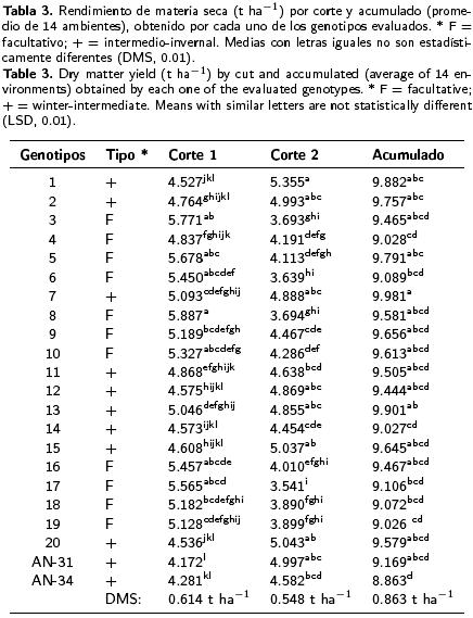 Con respecto a su patrón de producción, los genotipos facultativos se recomiendan para un solo corte. Los genotipos 3, 5, 10 y 19 fueron los más apropiados para las diferentes zonas donde se llevó a cabo el estudio, dado sus altos niveles de productividad y estabilidad. Los tipos intermedioinvernales son más recomendables para cortes o pastoreos múltiples, aunque pudieran existir genotipos facultativos que pueden adaptarse a esta condición en determinados ambientes, tal como lo demostró el elevado promedio de producción de materia seca obtenido por los genotipos 5 y 9 (F). Estos resultados apoyan también la posibilidad de diseñar mezclas forrajeras que combinen los diferentes patrones productivos para obtener una producción más uniforme a través de los cortes, favorecida por el posible efecto de relevo de los distintos tipos estudiados.