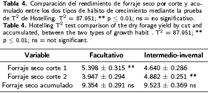 El rendimiento de forraje seco entre ambientes por corte y acumulado fue estimado mediante análisis de varianza (ANDEVA) combinados, para detectar la presencia de IG*A. Los tratamientos se compararon con la prueba de la Diferencia Mínima Significativa (DMS) al 0.01 de probabilidad. La comparación entre los rendimientos de materia seca por corte y el acumulado, entre los dos tipos de hábito de crecimiento, se efectuó con la prueba de T2 de Hotelling (Johnson 1998), la cual es una generalización de la prueba de t utilizada para comparar dos medias de determinada variable, con la diferencia de que considera simultáneamente todas las variables en estudio (rendimiento de forraje seco en cada corte y acumulado) de la manera siguiente: