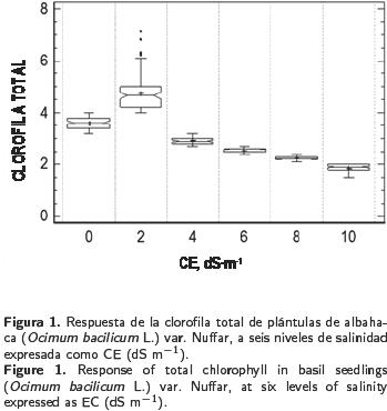 Los efectos de la salinidad fueron significativos sobre la clorofila total (F = 927.64; p < 0.001) (Tabla 1). Al contrastar las diferencias entre medias con la DMS de Fisher (Daniel WW 2004. Bioestadística. Limusa Wiley) se aceptó 1 % de riesgo de error al considerar cada par de medias como significativamente diferentes.
