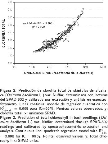 La capacidad para predecir el contenido de la clorofila en la hoja, con base en lecturas de fluorescencia o de reacción instantánea a un haz de luz, ha sido demostrada para diferentes especies vegetales, incluyendo Ficus benjamina L. and Populus deltoides Marsh (Loh F, Grabosky J, Bassuk N 2000. HortScience 35: 423424), pasto San Agustín (Rodriguez IR, Miller GL 2000. HortSci. 35: 751754) y sorgo (Yamamoto A, Nakamura T, AduGyamfi JJ, Saigusa M 2002. J. Plant Nutr. 25(10): 22952301). Sin embargo, la utilidad del medidor de la clorofila SPAD502 para la determinación rápida de la clorofila no ha sido explorada en albahaca. Por lo anterior, el objetivo de este trabajo fue calibrar la aplicación del medidor portátil de clorofila SPAD502 para determinar la concentración de la clorofila total en albahaca, en etapa de plántula para el trasplante.