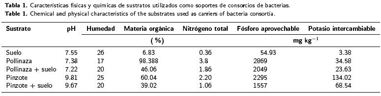 Para probar el potencial de los sustratos como soporte de los consorcios de Azospirillum y de Azotobacter, que permita seleccionar la mejor combinación sustrato + consorcio e integrar el biofertilizante, se estableció un experimento con 15 tratamientos y tres repeticiones por tratamiento. Se utilizaron dos factores, tipo de sustrato [suelo, pollinaza, pinzote, pollinaza + suelo, pinzote + suelo)] y tipo de consorcio de bacteria [sin consorcio (S/C)], con Azospirillum (C/Azop), con Azospirillum+Azotobacter (C/Azosp+Azot) y con Azotobacter (C/Azot)]. En total se establecieron 45 unidades experimentales, cada una fue una bolsa negra de polietileno de 27x28 cm con 500 g de sustrato agrícola e inoculado y no inoculado según tratamiento, manteniendo 32 % de humedad. Las características físicas y químicas de los sustratos y del suelo se reportan en la Tabla 1. Los consorcios estuvieron integrados por tres aislados de Azospirillum (FBAzop1, FBAzop2, FBAzop3) y tres de Azotobacter (FBAzot1, FBAzot2, FBAzot3), procedentes del suelo y rizósfera de plantas de banano de la plantación seleccionada. Los tratamientos fueron: suelo + C/Azopirillum (Bio1), pollinaza + C/Azopirillum (Bio2), pollinaza + suelo + C/Azopirillum (Bio3), pinzote + C/Azopirillum (Bio4), pinzote + suelo + C/Azopirillum (Bio5), suelo + C/Azospirillum + C/Azotobacter (Bio6), pollinaza + C/Azospirillum + C/Azotobacter (Bio7), pollinaza + suelo + C/ Azospirillum + C/Azotobacter (Bio8), pinzote+ C/Azospirillum + C/Azotobacter (Bio9), pinzote + suelo + Azopirillum + C/Azotobacter (Bio10), suelo + C/Azotobacter (Bio11), pollinaza + C/Azotobacter (Bio12), pollinaza + suelo + C/Azotobacter (Bio13), pinzote + C/Azotobacter (Bio14) y pinzote + suelo + C/Azotobacter (Bio15).