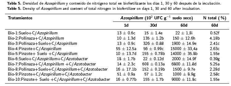 En los tres tiempos (días 1, 30 y 60) después de la inoculación de Azospirillum se observaron diferencias significativas entre medias de los tratamientos (p < 0.05) (Tabla 5), por efecto del sustrato y consorcio de bacterias utilizados en la formulación del biofertilizante. Los resultados indican que en los días 1 y 60 la formulación integrada por el Bio4 (pinzote + C/ Azospirillum) promueve el aumento de la población de Azospirillum ya que se alcanzaron tamaños máximos, con 55x102 UFC g1 suelo seco el día 1 y 150x104 UFC g1 suelo seco el día 60 (Tabla 5).