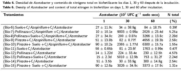 Al cuantificar los contenidos de nitrógeno total el día 60 después de la inoculación de los biofertilizantes con los consorcios de bacterias, se encontraron diferencias significativas entre las medias de los tratamientos (Tukey, p < 0.05). El mayor contenido de N (5.25%) se localizó en el Bio7 (pollinaza + C/Azospirillum y Azotobacter) con una densidad de Azospirillum de 68x104 UFC g1 suelo seco (Tabla 5) y Azotobacter de 20x104 UFC g1 suelo seco (Tabla 6). Los menores contenidos de N total (0.39%), de Azospirillum (22x102 UFC g1 suelo seco) y Azotobacter 17x104 UFC g1 suelo seco se muestran en el Bio6 (suelo + C/ Azospirillum y Azotobacter) (Tabla 5).
