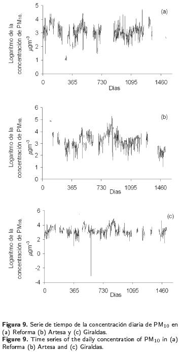 También existe correlación entre la humedad relativa (HR), la concentración de partículas suspendidas totales (PST) y las partículas de diámetro aerodinámico menor a 10 μm (PM10), como lo muestran los resultados de una investigación realizada en el suroeste de la Ciudad de México, en una zona de tipo residencial. Ahí se encontró que la correlación es de tipo inversa y que es mayor con las PST (r = 0.828) que con las PM10 (r = 0.749). También se estableció que existe diferencia significativa entre la concentración en temporada de secas y de lluvias, siendo mayor la concentración en la temporada de secas. Finalmente, se puso de manifiesto la importancia de estudiar el comportamiento anual de la contaminación ya que es importante en las exposiciones por periodos prolongados (AmadorMuñoz et al. 2001). La determinación de los patrones de distribución diurna y anual de los contaminantes ha permitido concluir si estos presentan ciclos diarios, tendencias a la disminución a largo plazo y comportamiento estacional. Para ello se ha analizado el comportamiento de estadísticas como la media aritmética, la mediana y el percentil 98 de los valores diarios, mensuales y anuales del contaminante DavydovaBelitskaya et al. 1999; Varó & Carratalá 2002).