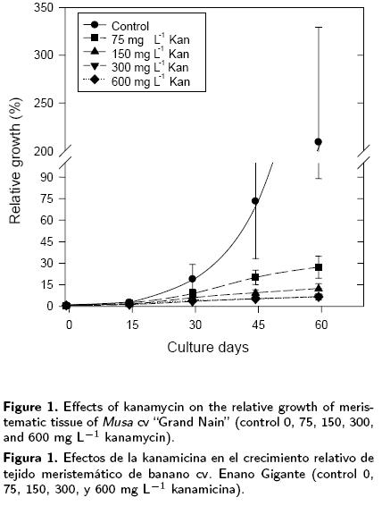 The molecular breeding of the banana plant is necessary considering its long life cycle and triploidy, as well as the sterility of most of the edible cultivars. Despite being one of the important food crops in the developing world, economically important cultivars of banana, including Cavendish and Lady Finger, have not benefitted from traditional plant breeding practices because of these major impediments (Khanna H, Becker D, Kleidon J, Dale J, 2004. Molecular Breeding 14: 239252). Hybrids produced by classical breeding programmes often lack one or more important characteristics such as flavour and aroma, a suitable postharvest physiology, fruit bunch shape, dwarfness, a short cycle, etc. Genetic engineering as an alternative method of banana improvement has the advantage that new characteristics can be brought into the plant without changing the desirable characteristics of the existing cultivar and, as the plant is vegetatively propagated,these characters, if expressed, offer an immediate genetic gain. Most transformation protocols require a tissue culture step, which allows the generation of transgenic plants through organogenesis or somatic embryogenesis using plant growth regulators and other compounds in the culture medium. Species including soybean, banana and sugar beet may be regenerated by both methods (Hansen G, Wright MS, 1999. Trends in Plant Science 4: 226231). Kanamycin is the selective agent most frequently used in the selection of transformed plants. Thus, knowledge on the sensibility to this antibiotic of particular explant species is a key element in the development of a transformation system integrating the gene for kanamycin resistance (nptll). Kanamycin has previously been used in the selection of transformed Musa AAA Grand Nain explants. The use of 100 mg L1 of kanamycin sulphate as a selective agent has been reported. Although ca. 50% of the apical meristems and 40 % of the corm slices formed shoots on the selective micropropagation medium, only 40 % of the tissues that formed shoots presented a vigorous root growth when transfered to a kanamycincontaining rooting medium. This result implied that ca. 60% of the shoots may have been chimeric and did not contain transformed meristematic tissue that would give rise to kanamycinresistant roots (May GD, Afza R, Mason HS, Wiecko A, Novak FJ, Arntzen CJ, 1995. Biotechnology 13: 486492). In other studies, embryogenic cells of Musa Grand Nain were bombarded and selected on a medium containing 100 mg L1 of kanamycin. Subsequently, kanamycin was omitted from an embryo germinating medium, but was reintroduced at the rooting stage when germinated embryos formed roots (Becker DK, Dugdale B, Smith MK, Hardin RM, Dale JL, 2000. Plant Cell Reports 19: 229234). Additionally, a kanamycin stimulant effect has been reported for the in vitro culture of several species (Costa MGC, Nogueira FTS, Figueira ML, Otoni WC, Brommonschenkel SH Cecon PR, 2000. Plant Cell Reports 19: 327332), as well as phytotoxicity with both undifferentiated calli and organogenesis and regeneration of shoots (Tang H, Ren Z, Krczal G, 2000. Plant Cell Reports 19: 881887). Both kanamycin and streptomycin favour shoot differentiation in tobacco leaf sections, and kanamycin also stimulates shoot production from carrot calli (Holford P, Newbury HJ, 1992. Plant Cell Reports 11: 9396).
