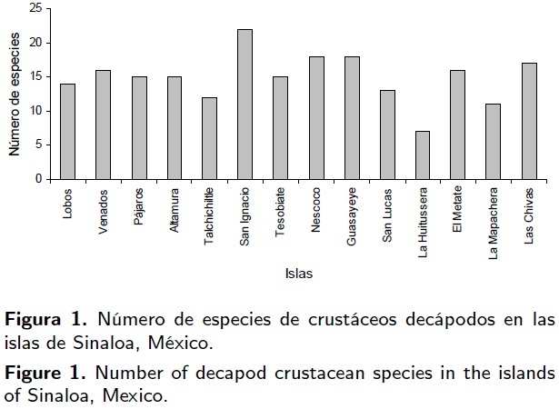 La Figura 1, muestra la cantidad de especies por isla, resultando una mayor incidencia en San Ignacio con 22 especies y una mínima en La Huitussera con siete, sin embargo, para las islas del litoral de Sinaloa en promedio la presencia correspondió a 15 especies. Esta variación es probable que este relacionado con la ubicación geográfica de las islas, por ejemplo, San Ignacio se encuentra localizada más alejada de la bahía de Navachiste, comunicando hacía un extremo de la isla directamente con el golfo de California, teniendo mayor influencia de la zona marina y con ello, especies de camarones (Litopenaeus stylirostris), jaibas (Euphylax dovii y Euphylax robustus) y cangrejos (Calappa convexa y Hepatus kossmanni) que no se recolectaron en otras islas de esta bahía, ni en el resto de los cuerpos insulares de Sinaloa (Tabla 1).