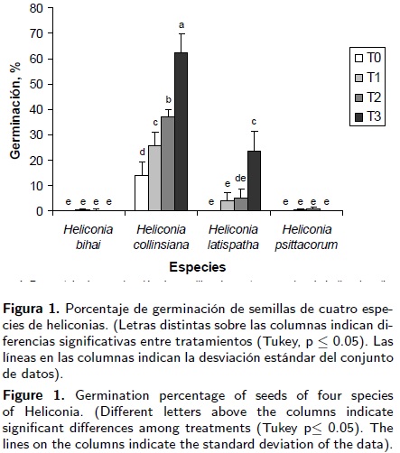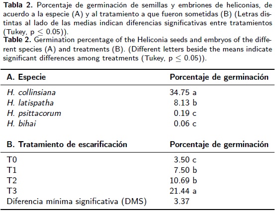 Los resultados obtenidos en este experimento muestran que la escarificación de semillas incrementa el porcentaje de germinación en las especies Heliconia collinsiana y H. latispatha. Las especies H. bihai y H. psittacorum presentan niveles muy bajos o nulos de germinación, aún con tratamientos de escarificación. En semillas de H. collinsiana el porcentaje de germinación alcanza casi el 90% cuando los embriones son extraidos para establecerlos en cultivo in vitro. Este último resultado representa una alternativa para la reproducción de esta especie y una estrategia para el desarrollo de sistemas de producción de semillas de la misma hasta ahora dependiente de importaciones.