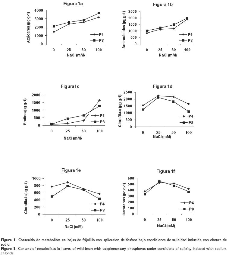 Las concentraciones de clorofila a y b aumentaron donde el fósforo se aplicó en 4 ó 8 meg L1 junto con 25 mM de NaCl, con relación al testigo y disminuyeron gradualmente con las interacciones del fósforo (4 ó 8 meq L1 ) con 50 y 100 mM de NaCl (Figura 1d y 1e). No obstante, las cantidades mayores de clorofila a y b se obtuvieron con la dosis baja de fósforo (4 meq L1 ).