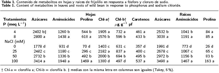 Las concentraciones de azúcares, aminoácidos y prolina, en hojas, fueron mayores con el nivel de fósforo de 8 meq L1. En cambio, la clorofila a, b y carotenos fueron mayores con la dosis baja de fósforo (4 meq L1). En las hojas de plantas tratadas con 100 mM de NaCl, la concentración de azúcares, aminoácidos, prolina y carotenos se incrementó, mientras que con 25 mM de NaCl se tuvo mayor cantidad de clorofila a y b, en comparación con el testigo (Tabla 1). En la misma tabla se presentan los promedios de azúcares, aminoácidos y prolina en raíces de frijolillo. Se observa que la concentración de azúcar y aminoácidos se incrementó en la medida que se aumentó la dosis de fósforo, mientras que la cantidad de prolina no tuvo efecto al mismo elemento. Las concentraciones de estos compuestos orgánicos aumentaron en función directa al grado de salinidad.