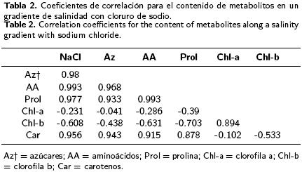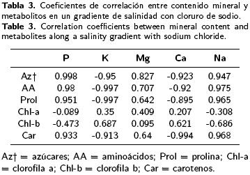 La correlación obtenida entre la cantidad de NaCl y la concentración de compuestos orgánicos fue positiva y significativa para azúcares, aminoácidos, prolina y carotenos, lo cuál confirma la respuesta observada gráficamente. Para la clorofila a y b, la correlación fue negativa y no significativa para la primera, y significativa para la segunda (Tabla 2). También se observaron correlaciones significativas entre los elementos minerales analizados y los compuestos orgánicos (Tabla 3). El P y Na se asociaron positivamente con la acumulación de azúcares, aminoácidos, prolina y carotenos. El K y el Ca se asociaron negativamente con estos mismos compuestos y positivamente con clorofila a y b.