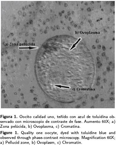 Se obtuvieron 68 ovarios de bovino, los cuales se trasladaron en solución salina al 0.9%, al laboratorio. La obtención de los oocitos se realizó mediante la técnica de punción folicular con jeringas de insulina con agujas calibre 18 g. Se puncionaron los folículos con diámetro mayor a 0.5 mm; el licor folicular extraído se colocó en una caja de petri de 5 cm de diámetro y fue observado bajo microscopía estereoscópica (Carl Zeiss 475822, Alemania). Una vez identificados los oocitos éstos fueron capturados con una jeringa de insulina adaptada a una micropipeta (Becton Dickinson No. 365878). Se seleccionaron los oocitos que presentaban características morfológicas idóneas de calidad uno (Lonergan P, Monagham P, Rizos D, Boland MP, Gordon I 1994, Mol Reprod Dev 37: 38-53); se lavaron en tres ocasiones consecutivas con solución de Fosfato Buffer Salina (PBS) 136.8 mM (Wilde O, Literat B, Vega A, Cautelan M, Cruz ML 1984, Rev Agron NO Arg 22: 63-66).