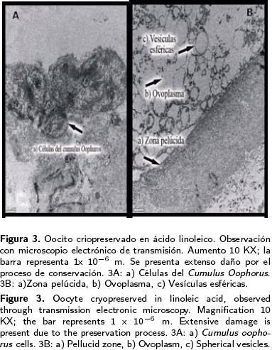 Los oocitos tratados tanto con ácido linoleico como con ácido oleico, presentaron un daño mayor que los criopreseservados con glicerol, los que mostraron una mejor integridad morfológica. El 25% de los oocitos tratados con ácido linoleico mostró daños severos en las células del Cumulus oophorus, incompatibles con los procesos vitales y el 100 % de los oocitos criopreservados con ácido oleico sufrieron daño severo como para ser utilizados en biología de la reproducción. De los dos ácidos grasos probados, el linoleico es el que mostró mejor efecto crioprotector aunque con desventaja con respecto al glicerol.