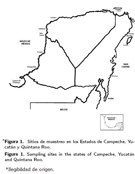 Las estaciones de colecta se seleccionaron con base en la distribución monoespecífica de las praderas de Thalassia testudinum, en ocho localidades, de dos ambientes costeros diferentes: el estuarino, que incluyó la Laguna de Términos, Estero Champotón, Tenabo, Isla Arena y Laguna Celestún. El segundo ambiente fue el arrecifal, representado por Puerto Morelos, Mahahual y Xcalak (Fig. 1).
