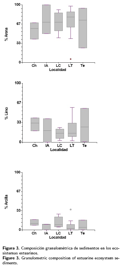 La textura de los sedimentos entre los diferentes ambientes estuarinos estudiados no presentó diferencias significativas entre las principales clases de grano: arena, limos y arcillas, lo cual indica ambientes muy heterogéneos, con variación hidrodinámica a nivel espacial (Fig. 3), es decir, la mezcla de arenas, limos y arcillas en diferentes proporciones, es característica de zonas someras y cercanas a la costa (Poppe et al. 2000).