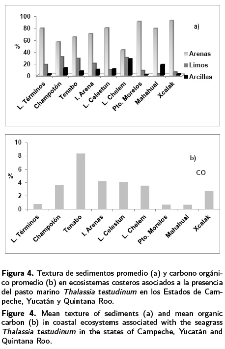 En Champotón, predominaron las arenas (68.87 %) en la porción norte sujeta a la influencia de la descarga fluvial, que tiene un volumen promedio anual de 451 millones de metros cúbicos (APICAM, 2004), mientras que en la sur, caracterizada por una gran densidad de pastos marinos prevalecieron los sedimentos limosos (41.48 %) y arcillosos (18.29 %). En el resto de esta zona el intervalo de limos fluctuó desde 19.41% a 41.48% y el de arcillas de 8.14 a 18.29 %. En la Laguna de Términos, las zonas con los porcentajes mayores de arenas (86.98 % - 90 %), se localizaron cerca a la boca de comunicación con el mar, lo que demuestra que el área estudiada donde habita T. testudinum es una zona con sedimentos primordialmente arenosos. En relación a la fracción lodosa, se estableció que los sedimentos limosos tuvieron 24.25 % en promedio y en cuanto a las arcillas en general, su porcentaje fue bajo (5.02 %-6.64 %).