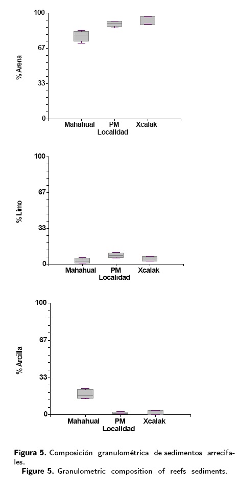 El porcentaje de arenas promedio para las zonas arrecifales, en orden decreciente fueron: Xcalak (91.8 %), Puerto Morelos (90.19 %) y Mahahual (78.55%), cuyas diferencias fueron significativas (p =0.002). Concerniente a las fracciones finas éstas no sobresalieron, ya que los limos estuvieron en un intervalo de 3.25-8.28 %, registrándose el promedio mayor en Puerto Morelos (8.28 %); y las arcillas en Mahahual tuvieron 18.2 % y su presencia fue mínima en Xcalak y Puerto Morelos con tan solo 2.53 % y 1.53 %, respectivamente (Fig. 5).
