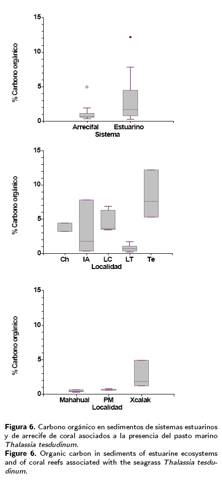En términos generales, los valores altos de C.O. en las zonas estuarinas se asocian con el aporte de materia orgánica derivada de la presencia de vegetación sumergida (pastos marinos) y marginal como es el caso del manglar (Gutiérrez et al. 2000), sin descartar el aporte por fitoplancton (Alongi 1998; Calva et al. 2006) asimismo, se consideró la entrada de material orgánico incluso de origen antropogénico, que llega a través de los aportes fluviales como es el caso de Champotón, donde el río junto con sus afluentes secundarios, conforma el principal recurso hídrico, además de ser uno de los ríos más importantes de la cuenca hidrográfica del sur del Golfo de México. En Tenabo, aunque no existen escurrimientos superficiales, se presenta un sistema hidrológico originado por la permeabilidad de los sedimentos calcáreos existentes en la zona, los cuales permiten la infiltración de agua, generando corrientes subterráneas (Troccoli et al. 2004). En Celestún los aportes de agua dulce son a través de afloramientos del manto freático en forma de manantiales dispersos en la laguna, los que aportan también materia orgánica. Se debe también mencionar que el intervalo de variación de C.O. fue superior en el caso de las zonas estuarinas (0.77 % a 8.37 %) en comparación con las arrecifales (0.53 % a 2.72 %) debido a que la zona del Caribe se considera como oligotrófica y a que las velocidades de las corrientes son mayores en comparación con las costas de Yucatán y Campeche (Troccoli et al. 2004) (Fig. 6)
