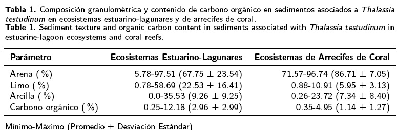 The textural distribution of the surface sediments and the content of organic carbon (C.O.) were analy-sed in coastal areas associated with turtlegrass meadows of Thalassia testudinum in two different coastal environments: coral reefs and estuarine-lagoon systems, in the states of Campeche, Yucatán and Quintana Roo. The distribution of the particle size and of the C.O. was different in the two types of coastal systems. Greater contents of fine sediments (silt and clay) and of C.O. were quantified in the estuarine environments, while sand and lower percentages of C.O. were predominant in the reef environments. However, in Xcalak (reef zone), the mean percentage of C.O. (2.72 %) was similar to those reported for estuarine areas, and the sortion theory was not accomplished here. The highest mean values of C.O. (8.37 %), of all the studied localities, were recorded in Tenabo. The T. testudinum seagrass meadows developed better in shallow, protected and low circulation areas (except for Champotón), both on sandy and muddy sediments.
