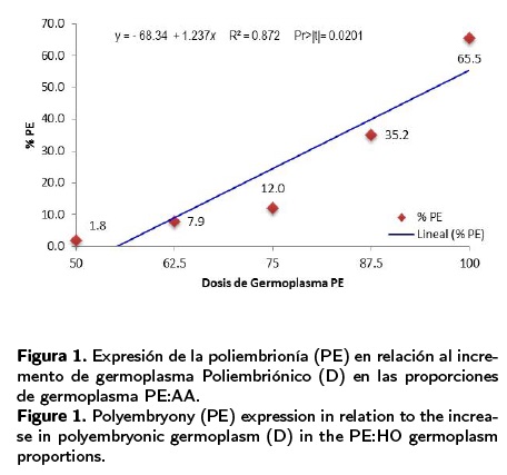 El análisis de regresión lineal, que denota la relación entre la frecuencia de PE en función de proporción de germoplasma, fue significativo (p ≤ 0.05); la proporción de la varianza explicada por el modelo (R2) fue 87.2%; esto indica que existe una relación entre dosis de germoplasmas y la expresión de la PE (Figura 1).