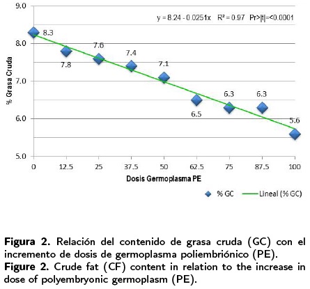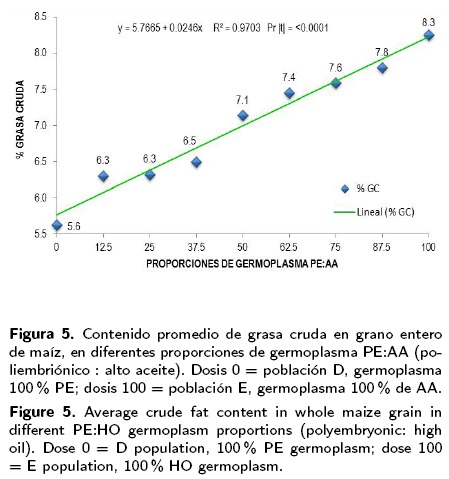 El análisis de regresión para GC con respecto a dosis (Figura 2) mostró relación lineal negativa. Esto se explica dado que la presentación de los resultados tiene al germoplasma E (alto aceite) como el punto de partida; a medida que se va sustituyendo con germoplasma D (poliembriónico, alta Lis. pero moderado contenido de aceite) los valores de grasa cruda se van reduciendo. Esta relación brinda la posibilidad de diseñar nuevos trabajos de investigación dirigidos a producir maíces de alto aceite. De acuerdo a estos resultados, las proporciones de germoplasma PE:AA en dosis 37.5 y 50% parecen ser los óptimos a utilizarse para conformar la base genética con la posibilidad de generar grupos genotípicos con 6 a 7% de aceites y , recuperar la PE, que significan lograr un nivel de Lis 30 a 50% superior al maíz normal. Recombinar materiales de estas categorías pudieran redituar en variedades de alto aceite y alta lisina comparables e incluso superiores a los maíces e híbridos modernos (Lambert 1994; Lambert et al. 2004).