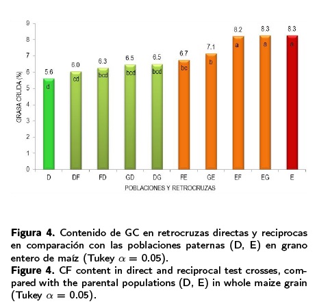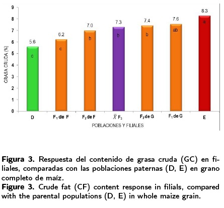 El análisis de regresión lineal para GC con respecto a dosis de germoplasma fue significativo (p <0.01), R2 de 97% (Figura 2). En la prueba de medias para contenido de grasa cruda resalta el hecho de que las F1, directas y recíprocas (F1de F y F1 de G), fueron estadísticamente diferentes (Figura 3.), lo cual pudiera indicar efectos recíprocos dada la dirección de la cruza. La cruza recíproca (G) fue 18% superior en contenido de GC a la cruza directa (F). Al comparar las filiales F2 (de F y G) y F3 (promedio de F3 de F y F3 de G), se observó que el promedio en GC de la F3 es muy cercano al promedio de las poblaciones y filiales, mientras que la F2 tiende a estabilizarse hacia un valor intermedio entre los progenitores.