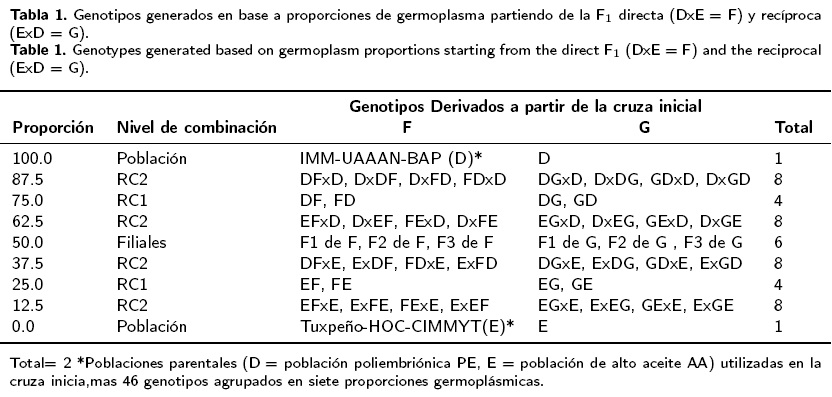 El estudio involucra el cruzamiento directo y reciproco entre D y E, (DxE = F y ExD = G); la F2 y F3 de cada cruza y las retrocruzas RC1 y RC2 (retrocruzas uno y dos) con ambos progenitores en forma directa y recíproca, que permitió generar proporciones que combinan PE y alto aceite (AA) con diferencias de 12.5% entre cada proporción (Tabla 1). La población C y sus cruzas directa y reciproca con E fueron utilizadas como referentes poliembriónicos; y como testigo el Híbrido comercial AN-447.