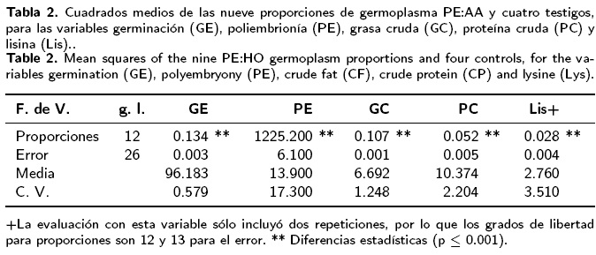 Las variables GC, PC y Lis presentaron valores altos en las diversas combinaciones entre D:E; el promedio varió de 5.6 a 8.3%, de 8.5 a 11% y de 2.2 a 4 g lisina en 100 g de proteína, respectivamente (Tabla 3). Las poblaciones base D y E, fueron superiores en GC al híbrido testigo (en porcentajes de 12 y 70%, respectivamente).