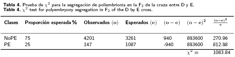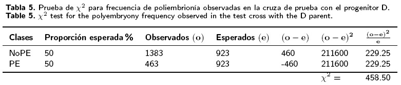 El análisis de regresión aportó evidencias de que la PE presente en D se relaciona con las dosis de germoplasma superiores a 50 % (Figura 1). El hecho del enmascaramiento de la PE en la cruza F1 con fuente No-PE (Tabla 3) y su recuperación en F2 y F3 y en las retrocruzas hacia D implica necesariamente establecer que la poliembrionía observada en este trabajo es de naturaleza recesiva. Para tratar de explicar los posibles mecanismos genéticos que controlan la PE, se plantea la hipótesis de herencia monogénica y de tipo recesivo. Para probar la hipótesis mencionada se utilizaron las frecuencias de PE observadas en F2 y RC1, del ciclo 2, utilizando una prueba de x2 de bondad de ajuste (Tablas 4 y 5). El análisis aportó evidencias estadísticas para rechazar la hipótesis (3:1 en F2 y de 1:1 en RC 1) ya que la frecuencia de PE en la F2 fue de sólo 3.4% y en la cruza de prueba RC1 de 25.1%. Valores por demás bajos con respecto a la frecuencia esperada en el caso de que la PE sea controlada por un gen mendeliano con segregación independiente. Como propuesta, estas proporciones pudieran ser explicadas en el caso de interacción génica de dos loci, con epistasis doble dominante, de penetrancia incompleta, lo que explicaría el hecho de que sólo se tenga una segregación del 3.4% de PE en lugar del 6.25%; proporción 15:1 (Klung & Cummings 2000).