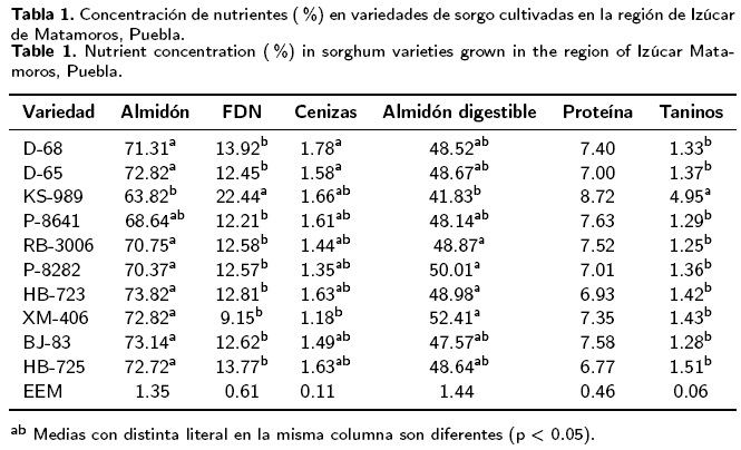 Se utilizaron diez variedades seleccionadas y donadas por la Fundación Produce Puebla A.C. de acuerdo a los criterios del Programa Elemental de Asistencia Técnica PEAT-99 del INCA Rural-Colegio de Postgraduados, Campus Puebla. Las variedades fueron: BJ-83, DS-65, DS-68, HB-723, HB-725, KS-989, P-8282, P-8641, RB3006 y XM-406. Para determinar las características nutricionales de las variedades de sorgo se determinó la concentración de almidón (Herrera & Huber 1989), proteína cruda, cenizas (AOAC 1990), FDN (Van Soest et al. 1991). Los taninos de determinaron por el método de la vainillina (Price & Butler 1977).