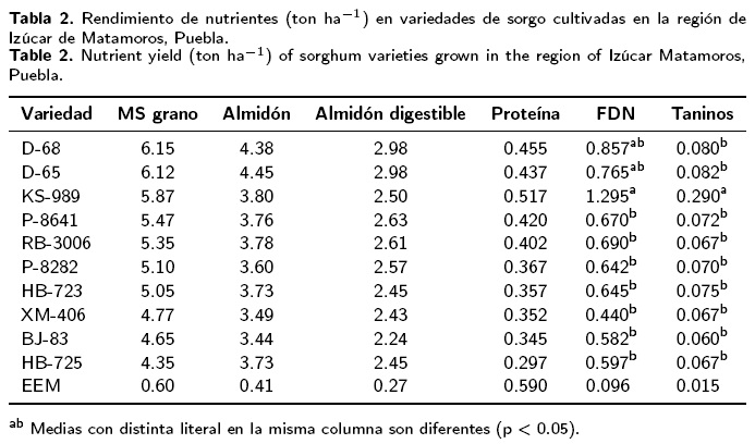 Se realizó un experimento para conocer la producción y el contenido de nutrimentos de diez variedades de sorgo cultivadas en una región cálida húmeda del estado de Puebla, México. Se utilizó un diseño en bloques al azar, se sembraron 10 variedades de sorgo en parcelas de 1.5 ha y se evaluó la concentración de almidón, almidón digestible en rumen, fibra detergente neutro (FDN), proteína, cenizas y taninos; la producción de grano y de nutrientes por ha también fue estimada. Se encontraron diferencias (p < 0.05) en la concentración de almidón, almidón digestible, FDN, cenizas y taninos entre las variedades. Los rangos de concentración de nutrientes (%) variaron entre: 63.8 a 73.8 de almidón (Media 71.02, EEM 1.35); 41.8 a 52.4 almidón digestible (Media 48.34, EEM 1.44); 9.15 a 22.4 FDN (Media 13.45, EEM 0.61); 1.18 a 1.84 cenizas (Media 1.55, EEM 0.11); y de 1.25 a 4.95 de taninos (Media 1.71, EEM 0.06). El contenido de proteína no fue diferente (p > 0.05). No hubo diferencias (p > 0.05) en los rendimientos (t ha-1 ) de almidón (rango de 3.16 a 4.45) y almidón digestible (rango 2.12 a 2.98). Tampoco en el rendimiento (kg ha-1 ) de proteína (rango 297 a 517), cenizas (rango 57.5 a 107.5) y taninos (rango 60 a 290). El rendimiento de FDN (kg ha-1) fue diferente (rango de 440 a 1295). A pesar de que hubo diferencias en la concentración de nutrimentos entre variedades, el rendimiento de nutrientes por hectárea fue similar.