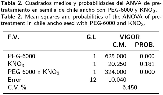 El efecto del osmoacondicionamiento en el vigor de la semilla de chile se evalúo a los 7 días con polietilen glicol (PEG) y AG3 o KNO3 tiempos de imbibición a 0, 6, 9 y 12 h. La mejor combinación fue 750 de PEG y 500 ppm de AG3 a nueve h (90.1%) y 750 de PEG y 200 ppm de KNO3 (88.9%) a 9 h de imbibición.